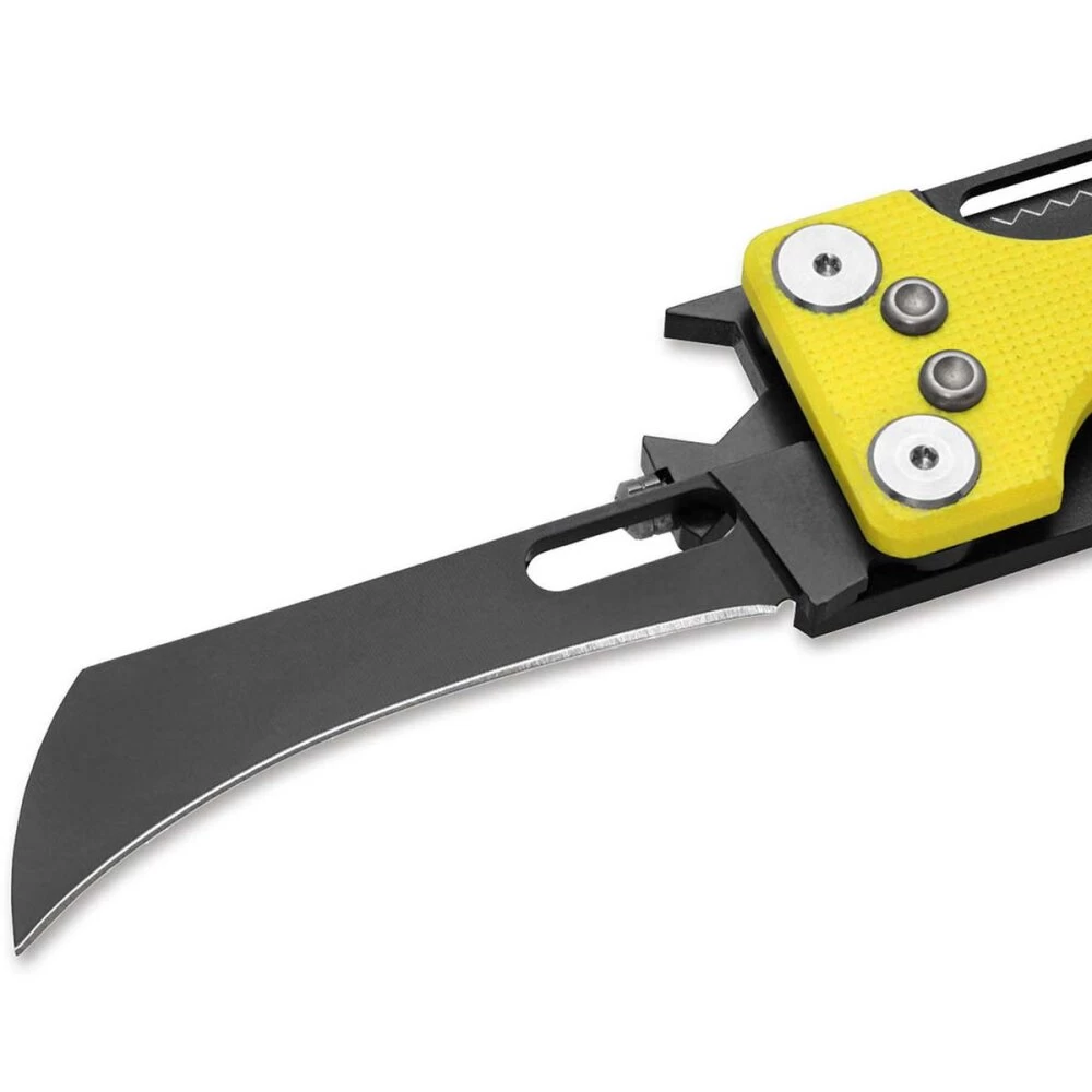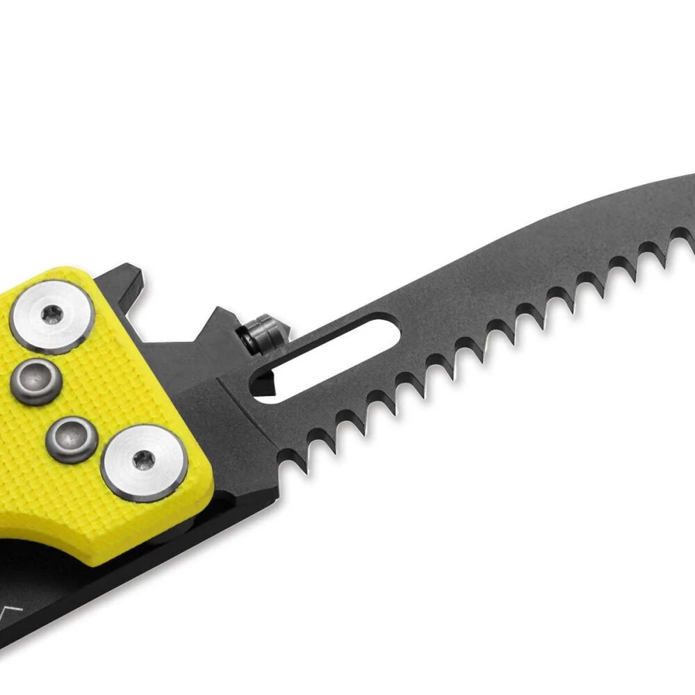 Der Hauptteil ist ein Hebel aus gehärtetem Nitro-B Stahl, der mit einer Meißelspitze samt Nagelzieher ausgestattet ist, wie man es von Stemmeisen kennt. Er wird verwendet, um die Kunststoffverkleidungen der Fahrgastzelle anzuheben bzw. zu entfernen. Auf der gegenüberliegenden Seite befinden sich zwei Schraubenschlüssel (10 und 13 Millimeter), die zum Lösen der Batterieklemmen dienen, sowie ein Hartmetall-Glasbrecher, mit dem man die Seitenscheiben einschlagen oder ein Loch für die Säge in eine laminierte Windschutzscheibe schneiden kann. Unter dem gelben G10-Griff befinden sich zwei Klingen: die Hauptklinge ist zum Durchtrennen von Sitzen und Polstern bestimmt und legt die Komponenten des Airbagsystems frei, das andere ist eine spezielle Säge für Verbundsicherheitsglas. Beide Klingen sind mit einer Button Lock Verriegelung ausgestattet, die sowohl in der Ruheposition als auch in der Arbeitsposition funktioniert. Auf dem G10-Griff und auf der Rückseite des Hauptkörpers befinden sich lumineszierende Aufkleber, die die Sichtbarkeit des Werkzeugs bei schlechten Lichtverhältnissen erhöhen. Ebenfalls auf der Rückseite befindet sich ein lasergraviertes Lineal, das bei der Planung von Schnitten an der Karosserie nützlich ist.