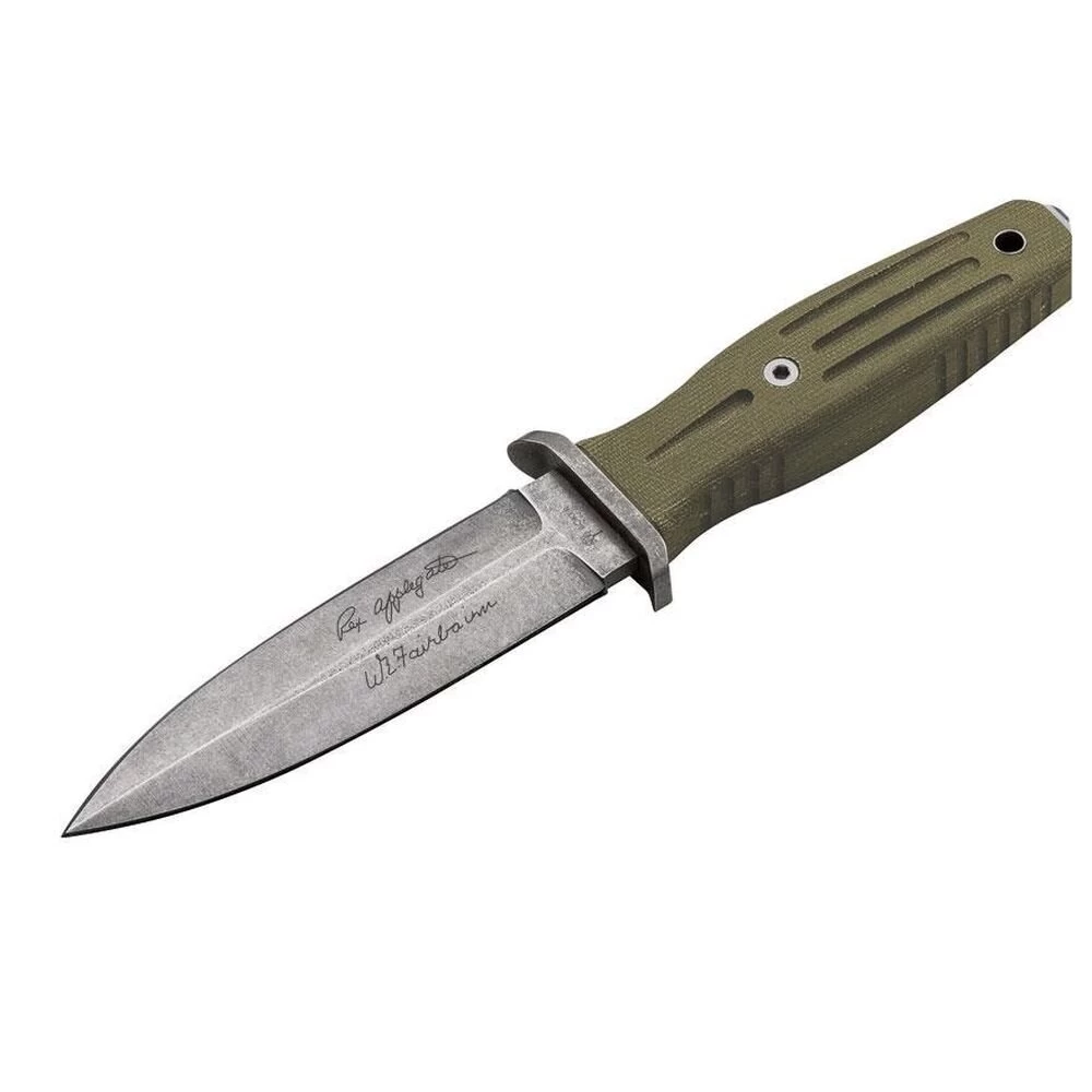 Schon seit Anbeginn der Serie ist es eine Selbstverständlichkeit, dem klassischen Applegate-Fairbairn eine kleinere Version zur Seite zur stellen. So war es höchste Zeit, dieses Projekt endlich auch für die sehr erfolgreich von Bill Harsey überarbeitete modernisierte Version 5.5 auf die Beine zu stellen. Der 4.5 mit viereinhalb Zoll Klingenlänge besitzt alle Tugenden des großen Bruders, erfreut sich jedoch einer größeren Handlichkeit, Führigkeit und eines gesteigerten Tragekomforts. Die Proportionen wurden behutsam dem neuen Maßstab angepasst, um die unbestrittenen Stärken dieses Konzeptes ohne Einschränkungen beizubehalten. Die Klinge aus N690 und das Parierelement weisen ein widerstandsfähiges Stonewash- Finish auf. Gestrahlte Canvas- Micartagriffschalen. Lieferung mit hochwertiger Cordurascheide.