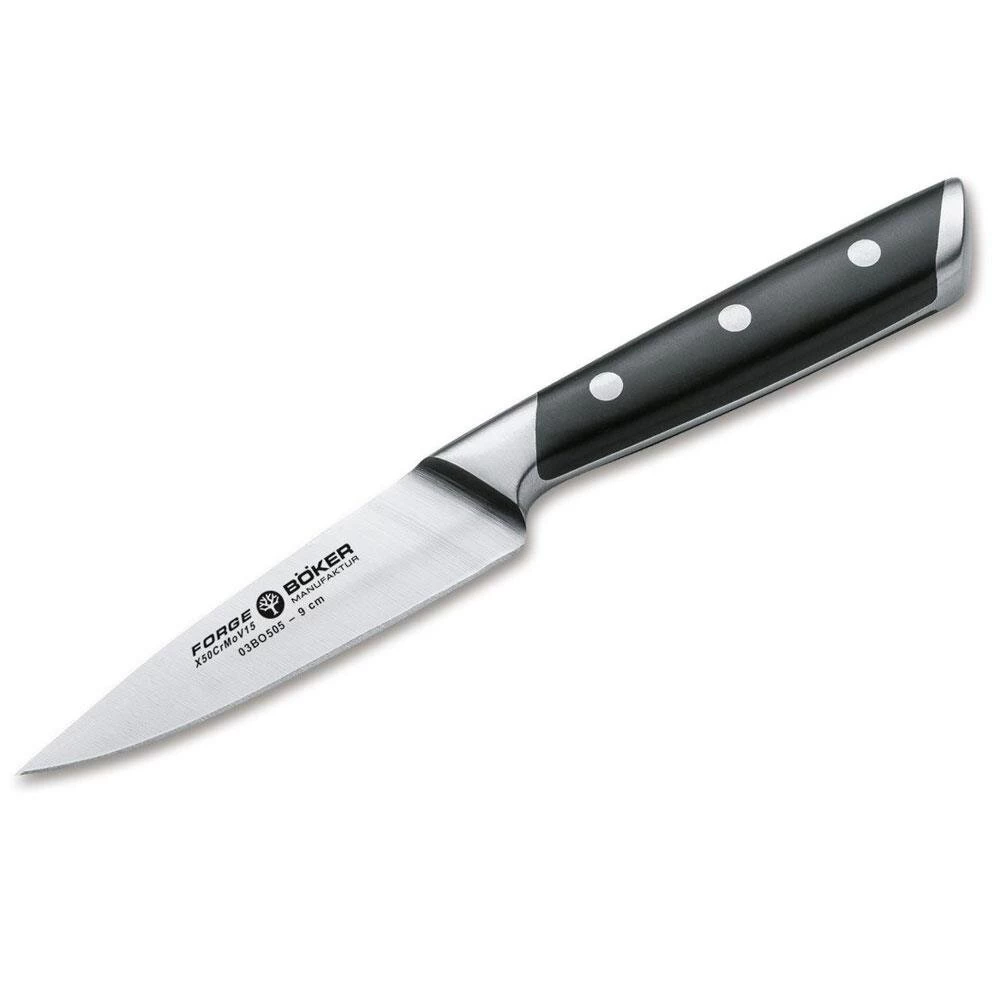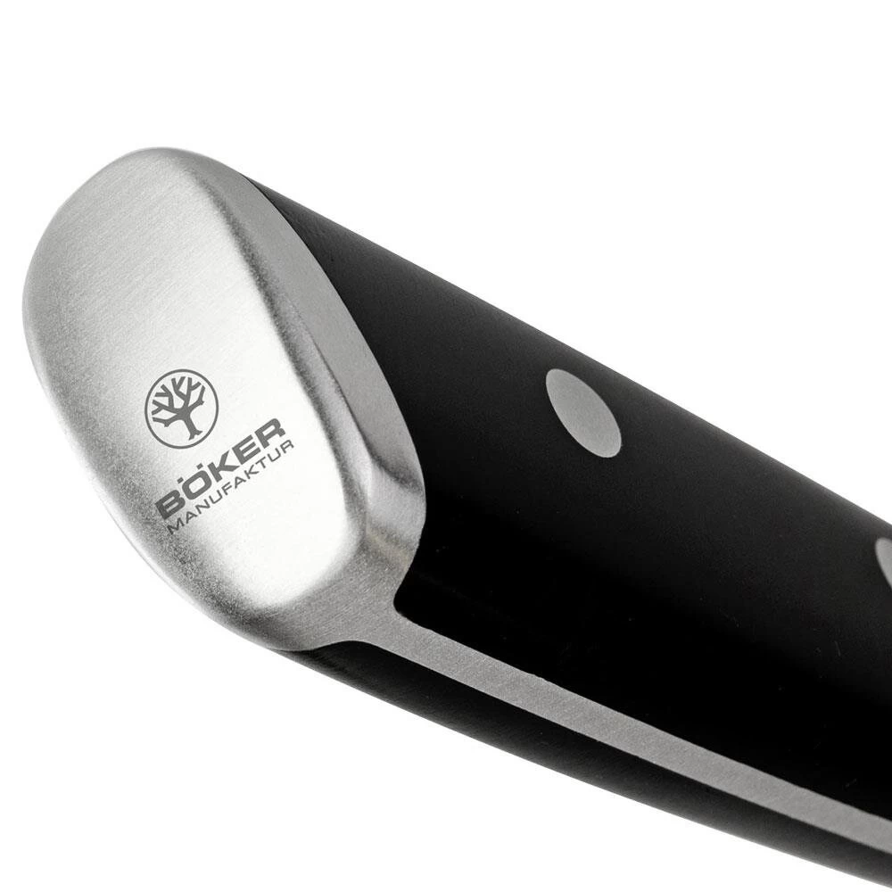 Die Kochmesser-Serie Böker Forge verbindet innovative und dynamische Formgebung mit klassischer Materialauswahl in Premiumqualität. Auffallend ist die attraktive Linienführung, die die Messer deutlich von der Masse der herkömmlichen Küchenmesser abhebt, ohne zu exzentrisch zu wirken. Darüber hinaus überzeugt die Serie Böker Forge mit einem ausgesprochen attraktiven Preis-Leistungs-Verhältnis. Die aus dem Chrom-Molybdän-Vanadium Edelstahl X50CrMoV15 gefertigten Messer sind optimal ausbalanciert und liegen durch die ergonomische Griffgestaltung perfekt in der Hand. Schwarze Griffschalen aus hochwertigem Spezialkunststoff werden klassisch mit drei Edelstahlnieten dauerhaft und ohne Fugen mit dem vollständig durchgehendem Messererl verbunden. Die Gestaltung der Klingen samt Übergang zum Kropf erlaubt ein problemloses Nachschärfen und gewährleistet in Kombination mit der richtigen Pflege eine langfristig perfekte Funktion der Messer. Bitte reinigen Sie die Messer nur per Handwäsche und nicht in der Spülmaschine. Darüber hinaus überzeugt die Serie Böker Forge mit einem ausgesprochen attraktiven Preis-Leistungs-Verhältnis. Die Auslieferung der Messer erfolgt in einer hochwertigen Geschenkverpackung.