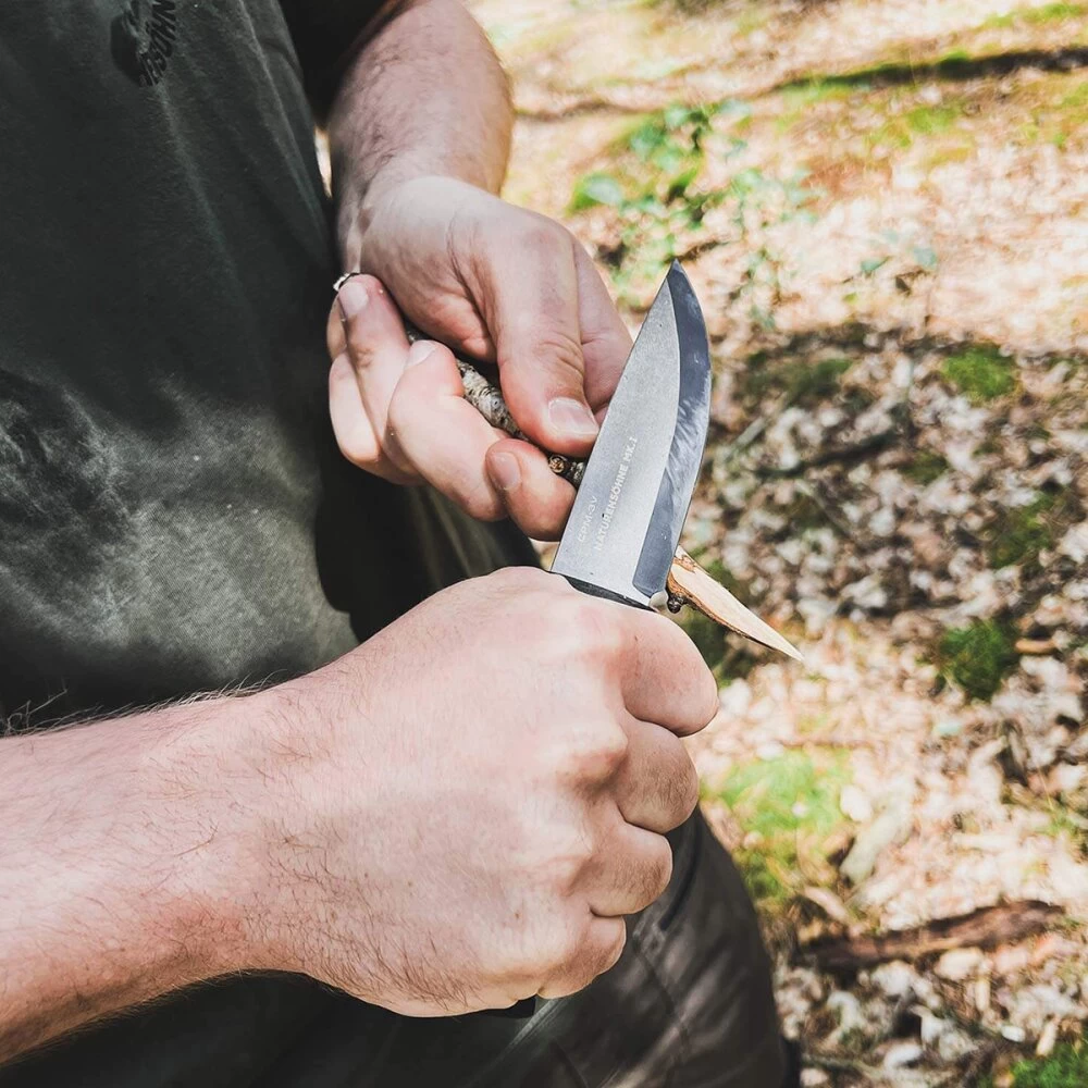 Gerrit und Andy, besser bekannt unter dem Namen ihres erfolgreichen Youtube-Kanals „Naturensöhne“, begeistern mit abwechslungsreichem sowie lustigem Content aus Bushcraften, Campen, Wandern und Ausrüstung allein auf Youtube ihre mehr als 490.000 Follower. Tendenz stark steigend. Vor mehr als zwei Jahren begann Böker mit den beiden Outdoorfanatikern die Arbeit an der Konzeption eines eigenen Naturensöhne-Messers, welches durch Ihre Nominierung für die 3. Staffel des Youtube-Erfolgsformates 7 vs. Wild, in den Ansprüchen noch einmal deutlich verschärft wurde. Da alle Ausrüstungsgegenstände zusammen in einer 1-Liter-Nalgene-Flasche untergebracht werden müssen, sah man sich gezwungen die Dimensionen des Outdoor-Messers vollständig zu überdenken. Herausgekommen ist das moderne und stilechte Böker Naturensöhne MK. I Feststehmesser – eine Sonderversionen des Bushcraft-Erfolgsmodells Böker Bronco. Während der umfassende Griff den Vollerl umschließt und eine exzellente Handlage und Griffigkeit gewährleistet, bietet die Klinge genau das, was beim kompromisslosen Outdooreinsatz in 14-Tagen Kanada vom wichtigsten Werkzeug erwartet wird: außergewöhnliche Schnitthaltigkeit, Schocklastverträglichkeit, Bruchelastizität und Splittersicherheit. Möglich macht das nicht nur der pulvermetallurgische Klingenstahl CPM 3V, sondern auch die ansprechende Premium-Beschichtung Hardur, welche ausschließlich bei hochwertigen Schneid- und Stanzwerkzeugen zum Einsatz kommt. Dabei umfasst eine 5µm dicke Hartstoffschicht die Klinge, sowie die Schneidphase, was die Standzeit der Klinge um ein Vielfaches erhöht und zudem eine reibungsverminderte Oberfläche schafft.