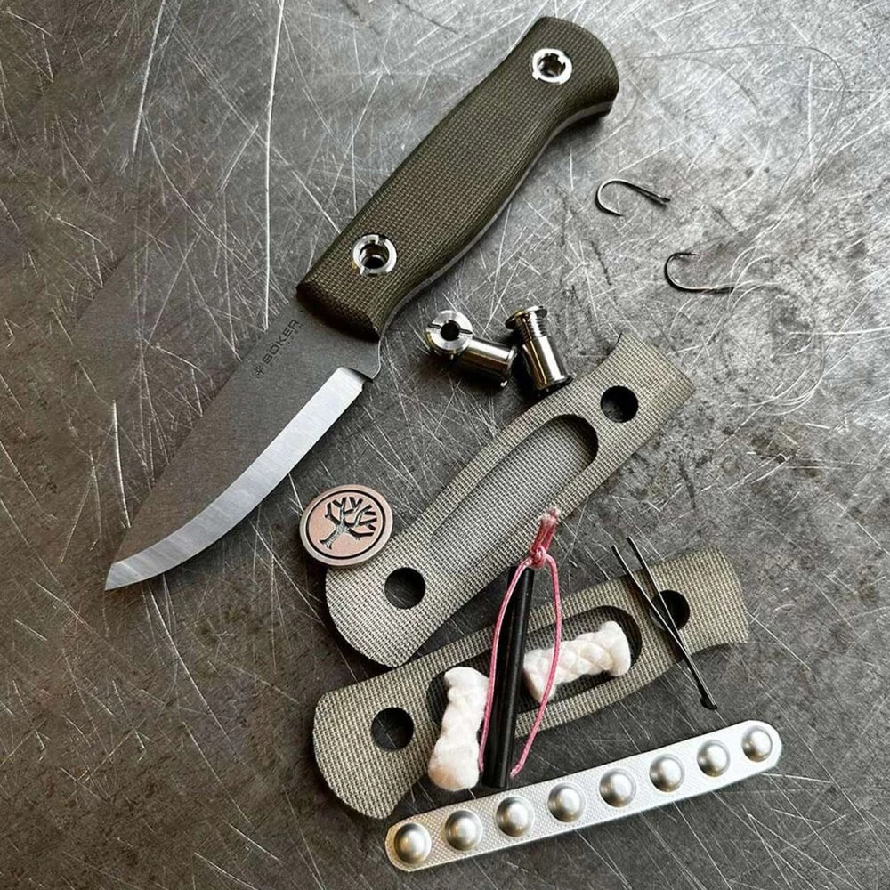 Basis für die Neuentwicklung ist das von Dave Wenger entworfene Böker Bushcraft Messer, welches aufgrund seiner Dimensionen nicht nur perfekt in die Flasche passte, sondern auf härteste Beanspruchungen ausgelegt worden ist. Die Wahl des Klingenstahls fiel auf Magnacut, der anders als die üblicherweise verwendeten Werkzeugstähle speziell für den Messerbau entwickelt wurde. Bei diesem Wunderstahl ist es gelungen, trotz des hohen Chromgehaltes von 10,7% und einer beeindruckenden Härtbarkeit von über 62-63 HRC, ein sehr feines Gefüge und damit hohe Zähigkeit und Schocklastverträglichkeit zu erzielen. In Kombination mit einem True-Scandi-Schliff trotzt die Klinge im Stonewash-Finish jeder Herausforderung. Von feinen Schneid- und Schnitzaufgaben zum Lagerbau und der Feuerholz-Vorbereitung, über Batoning und Hacken bis hin zur Wildversorgung meistert das stylische Freizeitmesser jede Aufgabe. Um den Platz in der Nalgene Flasche optimal auszunutzen, wurden die Griffschalen aus grünem Canvas Micarta flacher gehalten und gewährleisten auch im nassen Zustand eine perfekte Handlage. Ein besonderes Highlight befindet sich im Inneren des Griffs. Anstelle von Hohlnieten lassen sich 2 große Schrauben mithilfe einer Münze demontieren. Zum Vorschein kommt ein, gemessen an den Außendimensionen des Griffes, üppiges Fach mit einer Tiefe von 14 mm, indem beispielsweise eine Pinzette, Zunder, Kohletabletten, ein Angelset und Sicherheitsnadeln problemlos untergebracht werden können. Auch als skelettiertes Messer ohne Griffschalen macht das Böker Vigtig vs. Wild eine hervorragende Figur und unterstreicht seine Vielseitigkeit. Das moderne Taschenmesser wird durch eine kompakte schwarze Kydexscheide mit Clip komplettiert und rundet dein neues Lieblingsgadget in seiner Perfektion ab.