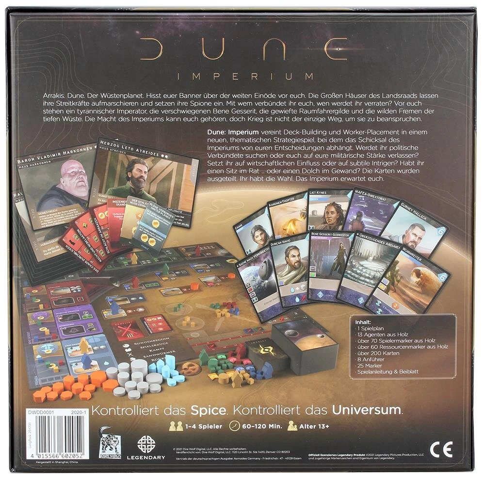 Hisst Euer Banner über der weiten Einöde vor Euch. Die großen Häuser des Landsraad lassen ihre Streitkräfte aufmarschieren und setzen ihre Spione ein. Mit wem wollt Ihr Euch verbünden, wen wollt Ihr verraten? Vor Euch stehen ein tyrannischer Kaiser, die verschwiegenen Bene Gesserit, die gewiefte Raumfahrergilde und die wilden Fremen der tiefen Wüste. Die Macht des Imperiums kann Euch gehören, doch Krieg ist dabei nicht der einzige Weg, um sie zu beanspruchen.
