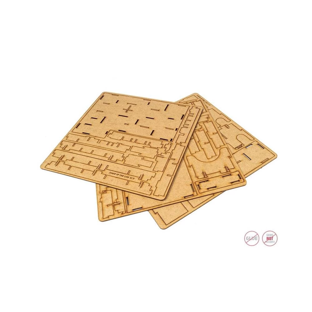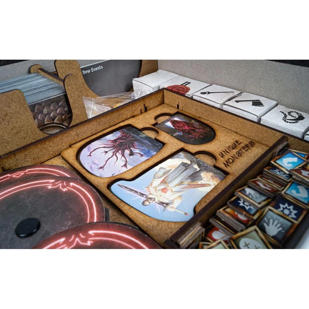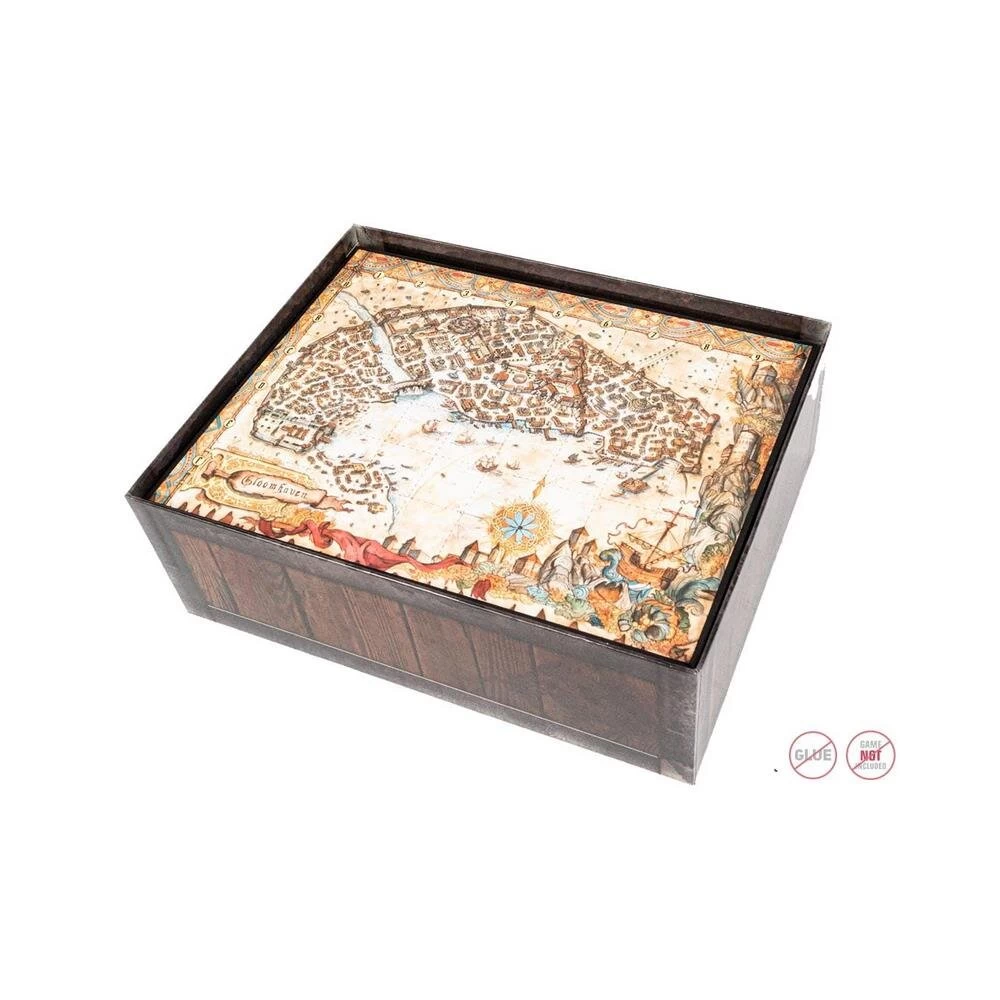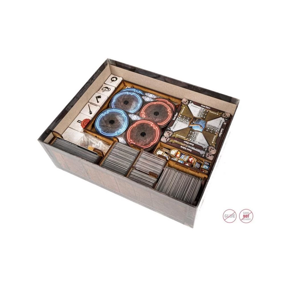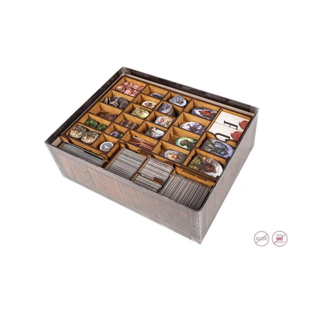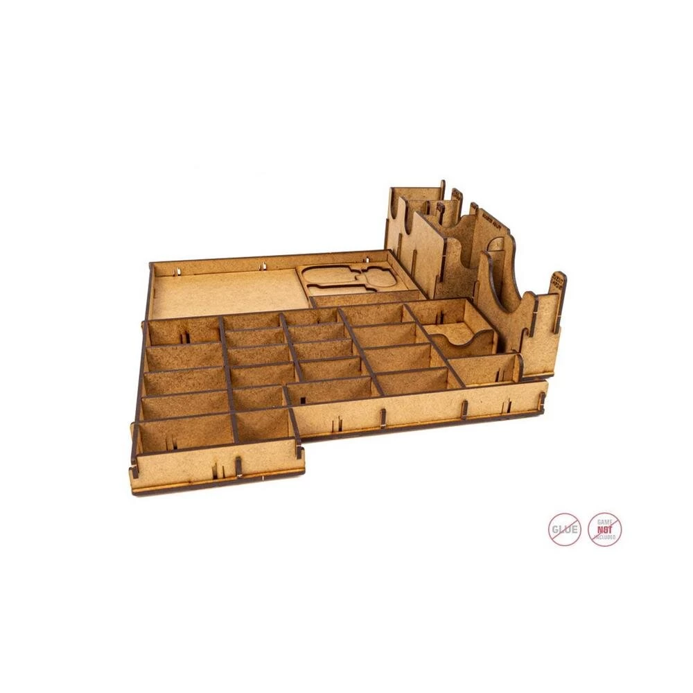 Mit dem Einsatz können alle Komponenten des Grundspiels sowie der Erweiterung verstaut und geordnet werden – kein Chaos mehr in der Schachtel oder auf dem Tisch, keine unnötige Suche nach Material während des Spiels. Auch der Spielplan und die Anleitung passen problemlos in die Box, ohne dass es Probleme beim Schließen der Schachtel gibt. Es ist stabil und besteht aus High-Density Faserplatte. Für den Zusammenbau wird kein Kleber benötigt. Der Einsatz kann auch alle Karten in Hüllen (gesleeved) aufnehmen.