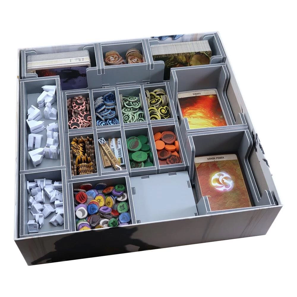 Der Folded Space Einsatz ist kompatibel mit der Spirit Island Grundbox sowie der Ast und Tatze Erweiterung. Alternativ kann es als Einsatz für die Erweiterung Zerklüftete Erde dienen. Das Design bietet sowohl effiziente Aufbewahrung als auch ein verbessertes Gameplay. Viele der Fächer können während des Spiels verwendet werden und erleichtern das Auf- und Abbauen erheblich. Die Regeln dienen als Deckel auf den Einsätzen.