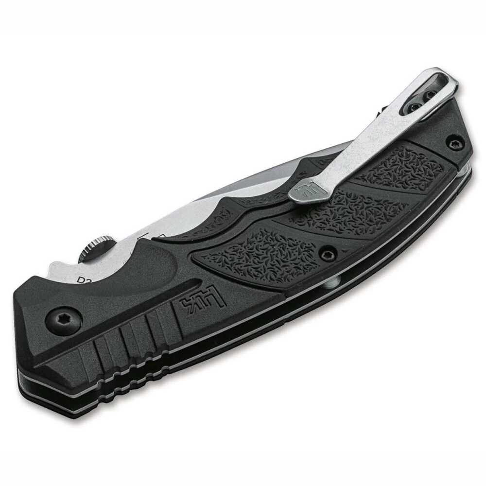 Das Heckler & Koch SFP Tactical Folder ist ein zuverlässiges Einsatzmesser, das Designelemente der weltbekannten Pistole aufnimmt und mit seiner robusten Spearpoint-Klinge aus D2 überzeugt. Die Selbstladepistole des deutschen Waffenherstellers verfügt serienmäßig über einzigartige Charakteristika und innovative Details, die das Messer konsequent aufgreift. Die Klinge des Messers ist mit einem Stonewash-Finish versehen und wird per demontierbarem Daumenpin geöffnet. Sie wird von einem stabilen Linerlock sicher arretiert. Die Stahlplatinen tragen eine Beschalung aus Polypropylen, die an strategischen Stellen mit direkt aufgespritzten, rutschfesten TPR-Gummieinlagen versehen ist. Dank der ergonomisch geformten Fingermulden, die dem Griff der SFP9 nachempfunden sind, liegt das Messer selbst bei Nässe stets sicher in der Hand und kann auch mit Handschuhen problemlos bedient werden. Die Griffschalen und der Deep-Carry-Clip (Tip-up/r) sind mit einem geprägten Heckler & Koch Logo versehen. Das Messer wird mit einem hochwertigen Nylon-Etui zur Aufbewahrung geliefert.