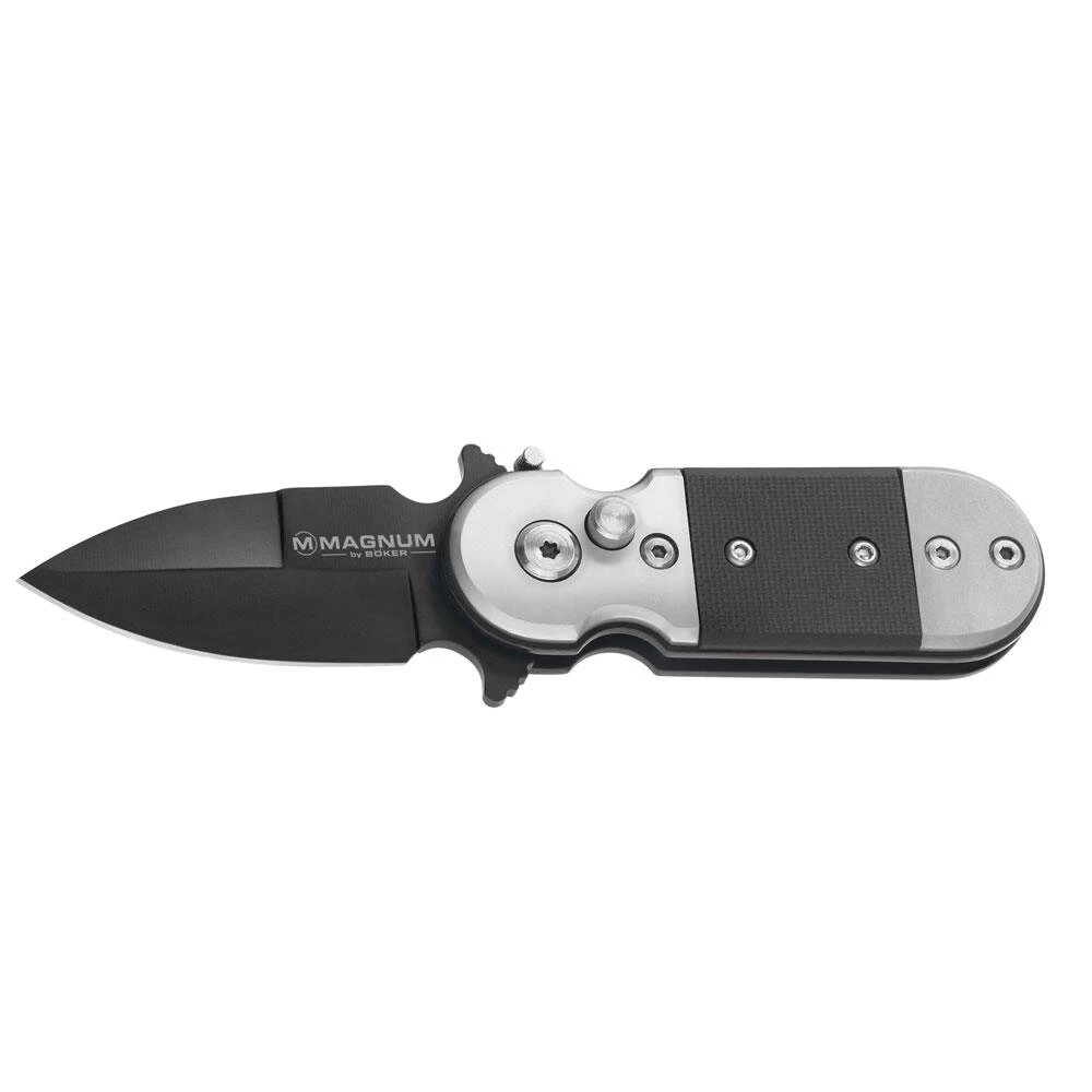 Dieses handliche und klein dimensionierte Springmesser wirkt sehr futuristisch. Der solide verarbeitete Griff besteht aus einer Kombination von gestrahltem Edelstahl und schwarzen G-10-Schalen. Die rostfreie 440er Klinge ist geschwärzt und besitzt einen doppelseitigen Handschutz. Eine Sicherung verhindert ein ungewolltes Auslösen der Klinge. Inklusive Taschenclip.