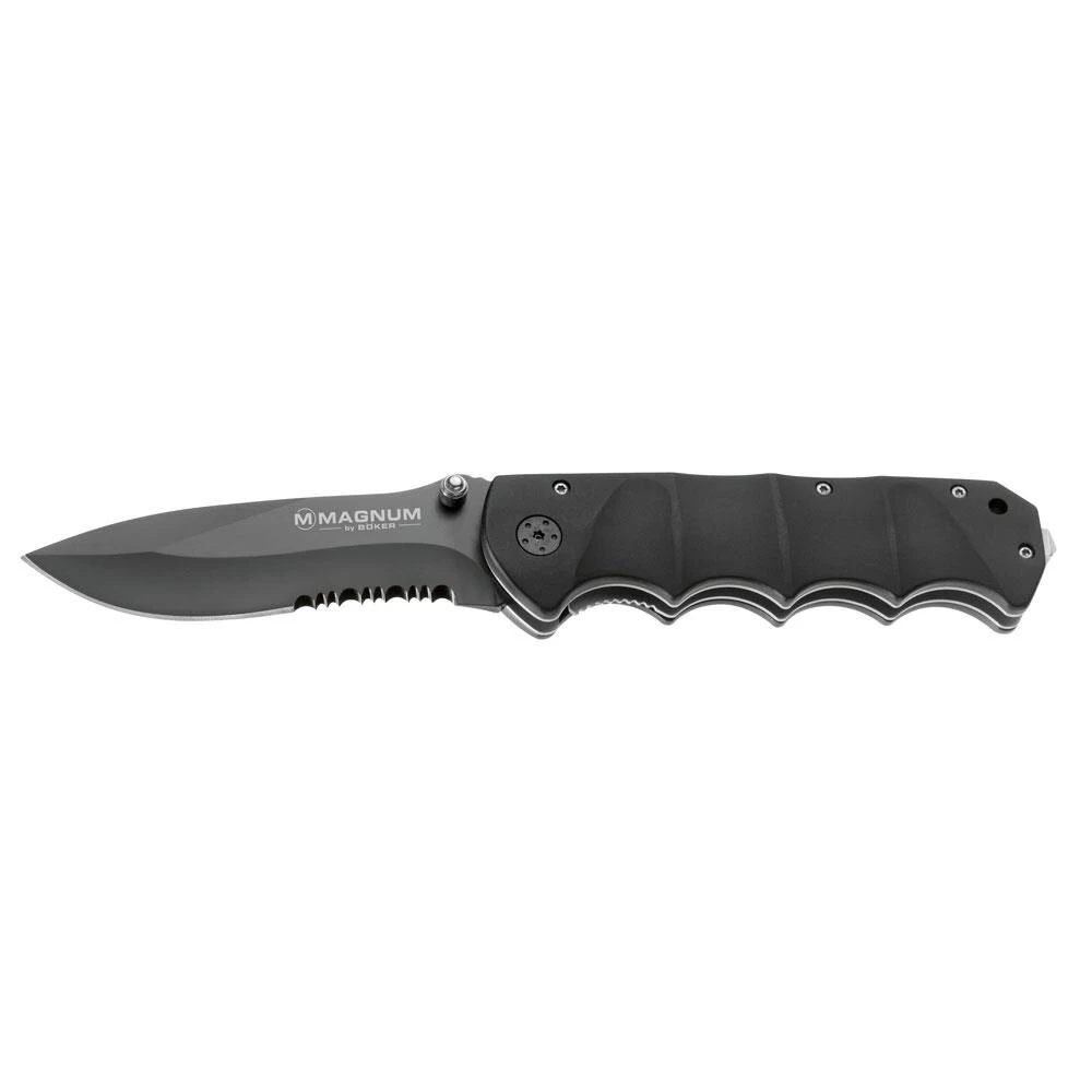 Dieses Einsatzmesser schreckt vor keiner Mission zurück! Die modifizierte 440er Spearpointklinge mit ihrem leichten Recurveschwung besitzt einen effektiven partiellen Wellenschliff für?s Grobe! Der Linerlock sorgt für die notwendige Sicherheit. Durch die ausgeprägten Fingerrillen des schwarzen Aluminium-Griffes ist stets eine hohe Arbeitssicherheit bei allen Schneidarbeiten gegeben. Inkl. Glasbrecher, Fangriemenöse und Hosenclip.