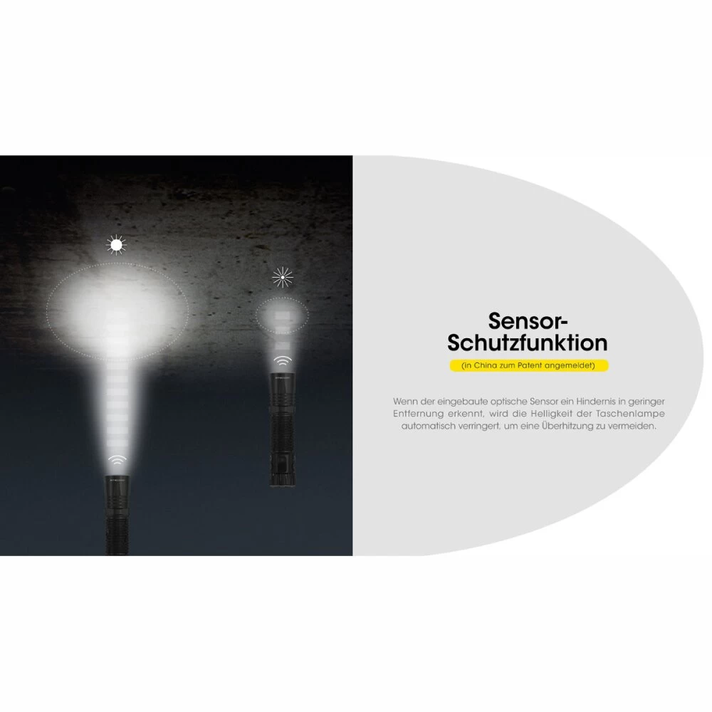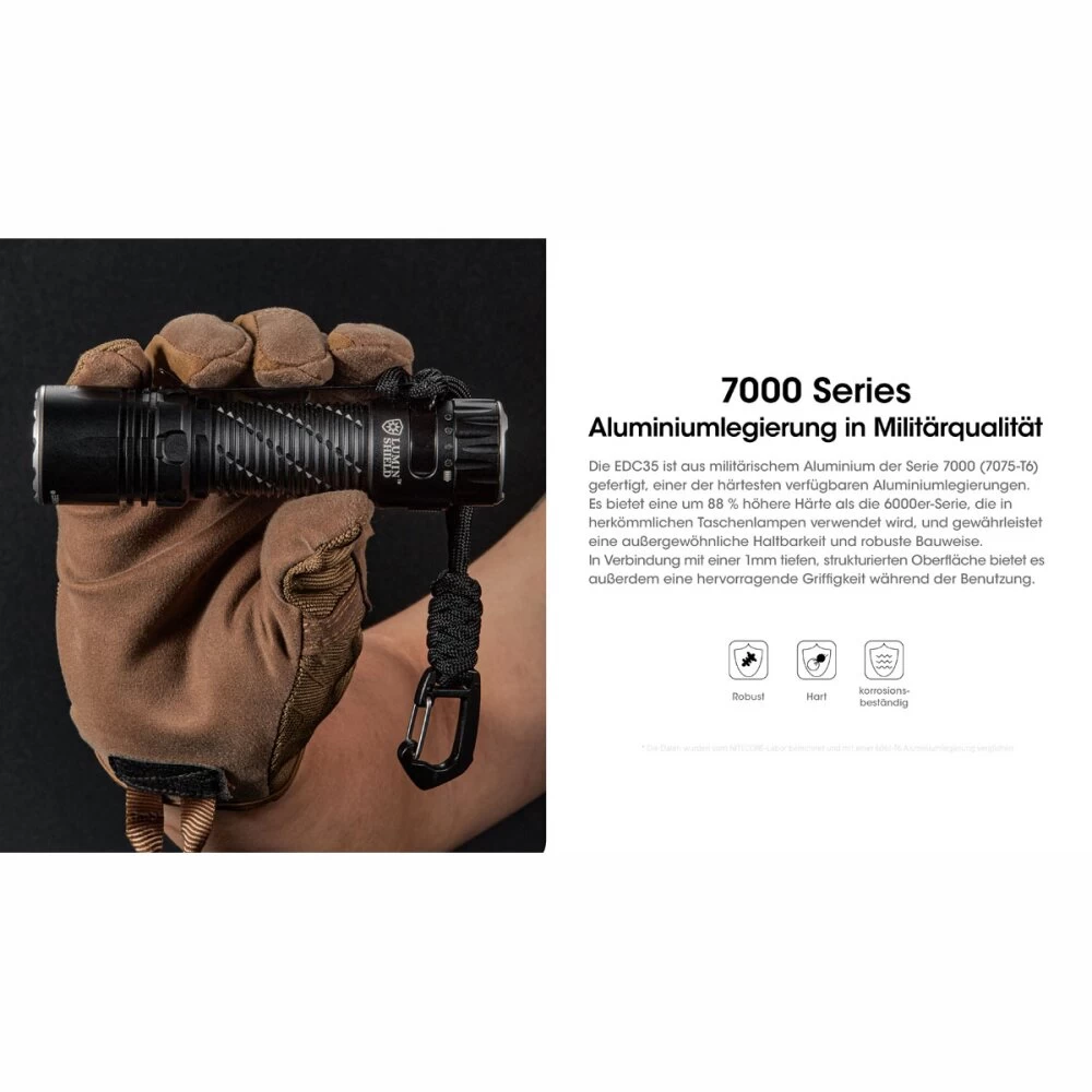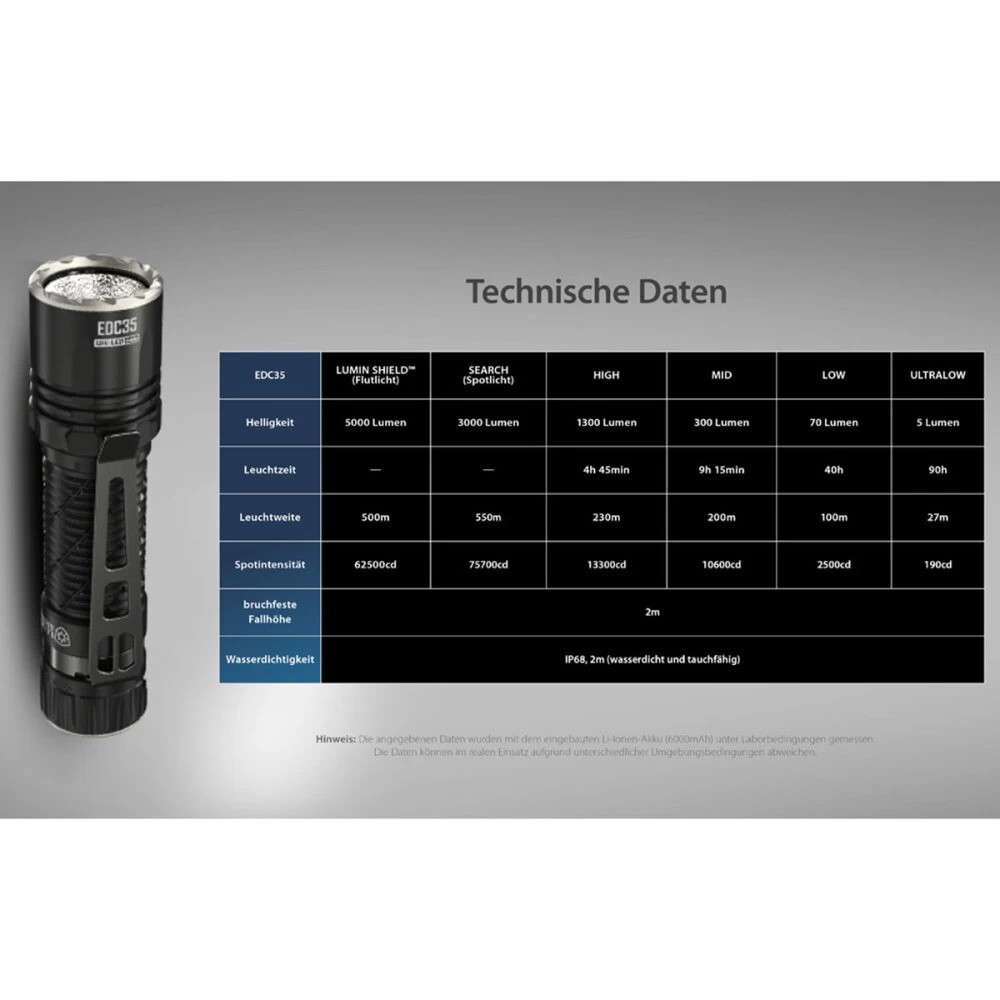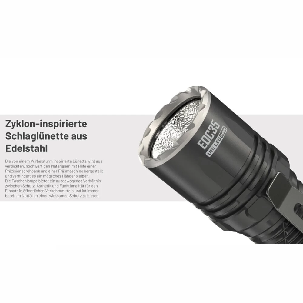 Die Nitecore EDC35 ist eine extrem leistungsstarke und kompakte EDC-Taschenlampe, die mit taktischen Features beeindruckt. Mit 9 LED-Kernen der NiteLab UHi 40 MAX LED bietet sie eine unglaubliche Leistung von bis zu 5000 Lumen. Die Taschenlampe verfügt über ein starkes Spotlicht mit 3000 Lumen und einer Leuchtweite von 550 Metern durch die Ansteuerung der LEDs. Die Funktion Lumin Shield schaltet die 8 außen angeordneten LEDs hinzu und sorgt für ein Flutlicht mit 5000 Lumen. Ein weiteres Highlight ist der fest verbaute 21700er Li-Ion Akku mit einer Kapazität von 6000mAh. Die EDC35 kann über einen mechanischen Lockout gesperrt werden und der Heckschalter ist als Zwei-Stufen-Schalter ausgelegt. Die Funktionen Lumin Shield und SEARCH sind als Momentlicht konzipiert und können nicht dauerhaft eingeschaltet werden. Zudem erkennt ein optischer Sensor Hindernisse vor der Linse und reduziert die Leuchtstärke, um Schäden zu vermeiden.