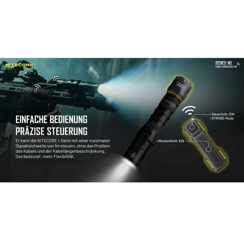 Der kabellose Fernschalt RSW2i WL von Nitecore setzt neue Maßstäbe. Durch die kabellose Bedienung der Taschenlampe gewinnt der Nutzer enorm an Bewegungsfreiheit, kein lästiges Kabel mehr mit dem man irgendwo hängen bleibt, kein Kabelbruch.