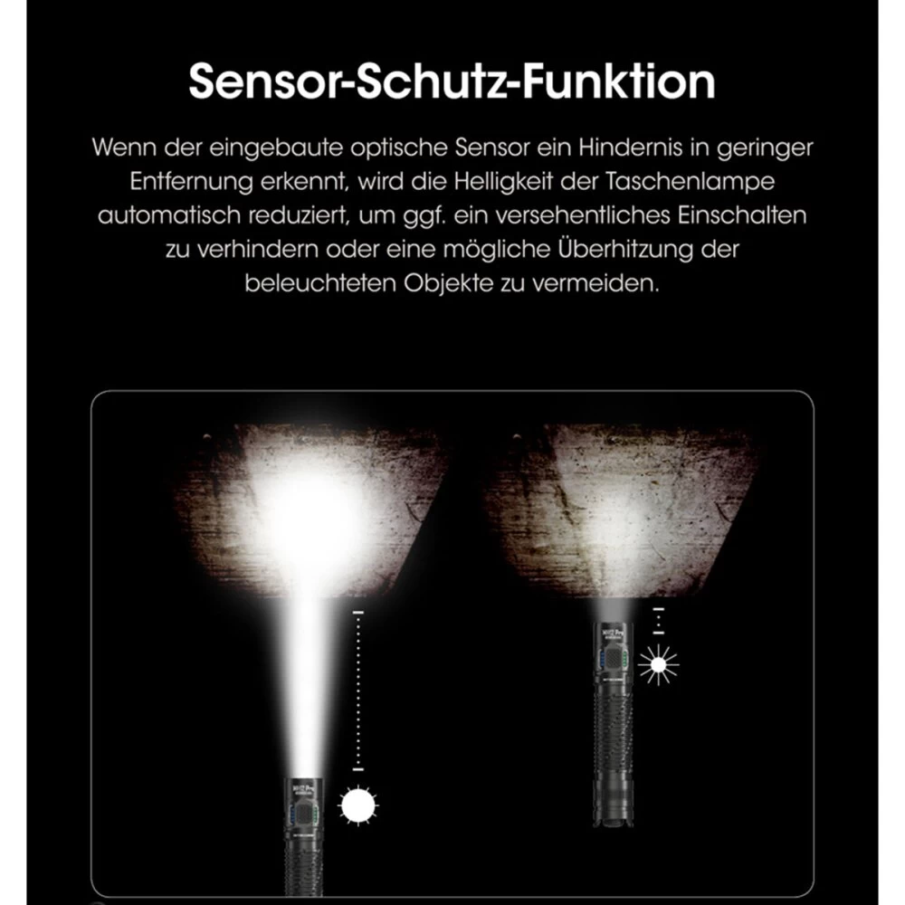 Ein eingebauter optischer Sensor reduziert die Leuchstärke der MH12 Pro sofort um eine Beschädigung der Lampe oder eines Gegenstandes (z.B. Rucksack) zu verhindern.