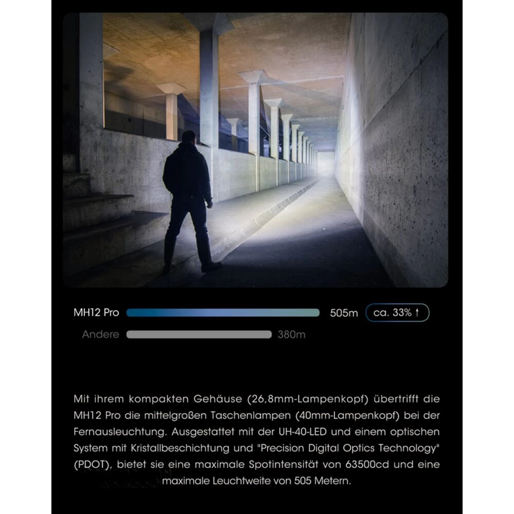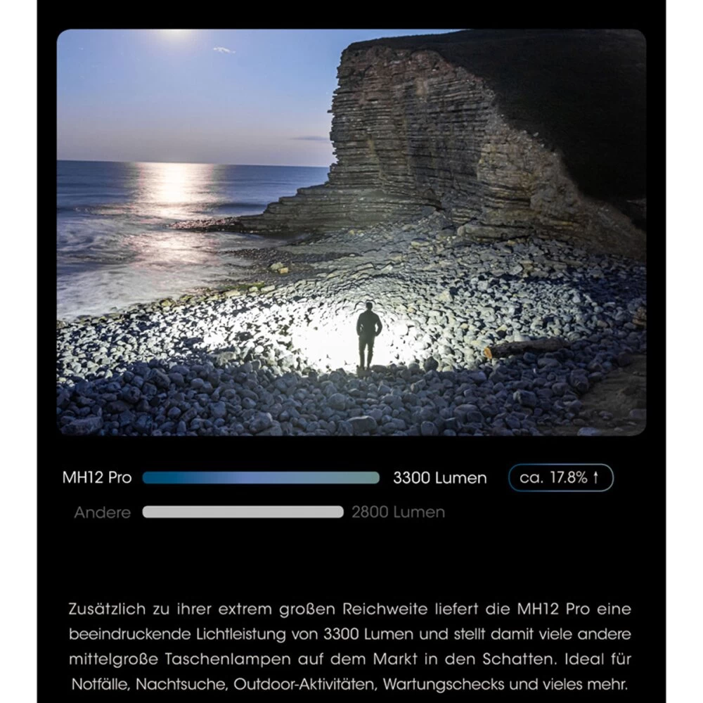 Die Leistungsdaten der MH12 Pro sind beeindruckend und konkurrenzlos bezogen auf die Baugröße der Lampe: 3300 Lumen Leuchtstärke, 505 Meter Leuchtweite, USB-C-Aufladung, 5300mAh Akku.