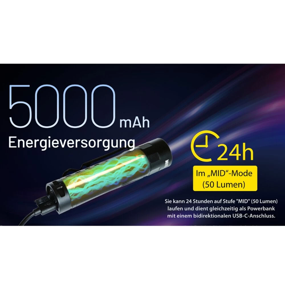Die MH15 leistet maximal 2000 Lumen und wird über einen Heckschalter bedient. Der fest integrierte Li-Ion Akku mit einer Kapazität von 5000mAh wird über einen USB-C-Anschluss in der Lampe geladen. Der Akku kann auch als Powerbank mit einer maximalen Ausgangsleistung von 18W genutzt werden. Die weiche Flutlicht-Beleuchtung ist ideal für Nachtwanderungen, Nachtangeln, Camping und mehr. Restenergie-Anzeige: per kurzem Druck auf den Heckschalter zeigen LEDs die verbleibende Akkuleistung an.