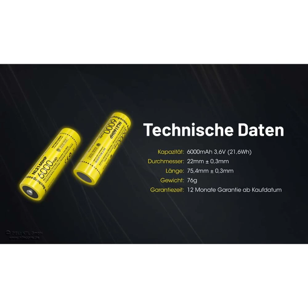 Der Nitecore Li-Ion Akku vom Typ 21700 NL2160HP verfügt über eine Kapazität von 6000mAh und kann einen maximalen Entladestrom von 20A liefern. Er ist mit einer Schutzschaltung ausgestattet, die vor Überspannung, Tiefentladung und Kurzschluss schützt. Der 21700er Akku wird zunehmend in leistungsstarken Taschenlampen eingesetzt, um die Betriebsdauer zu verlängern.