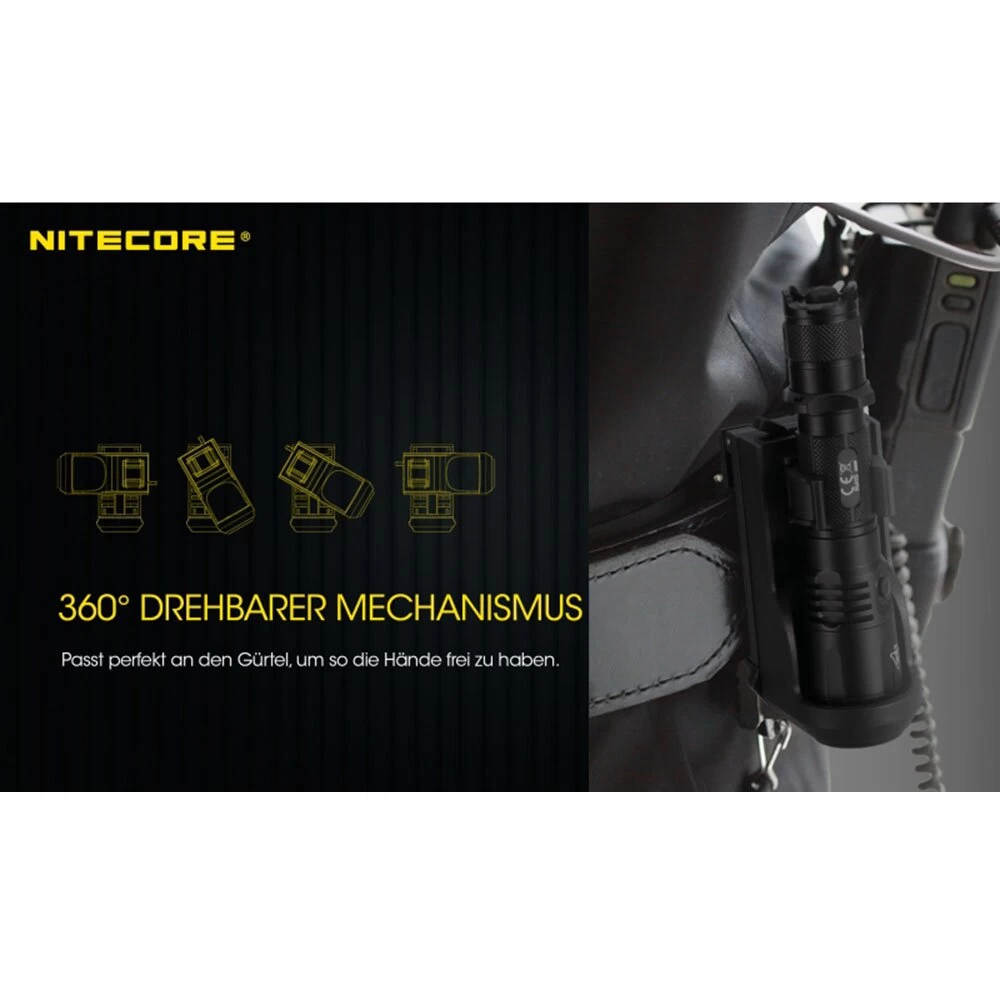 Während des Transports im Holster kann die Lampe mittels eines Sperrmechanismus fixiert werden, um somit den Verlust der Lampe zu verhindern. Verwendet am Gürtel, kann die Front des Holsters um die vollen 360 Grad gedreht werden, was eine individualisierte Anwendungsart des Holsters sowie einen sofortigen Zug der Lampe in alle Richtungen ermöglicht. Neben der Möglichkeit das Holster an einem Gürtel zu befästigen, ist es auch mit einem Clip ausgestattet der es ihm ermöglicht am üblichen MOLLE System angebracht zu werden. Während der Nutzung am Gürtel, kann der Clip des Holsters so eingestellt werden, dass er sich genau dem Durchmesser anpasst.