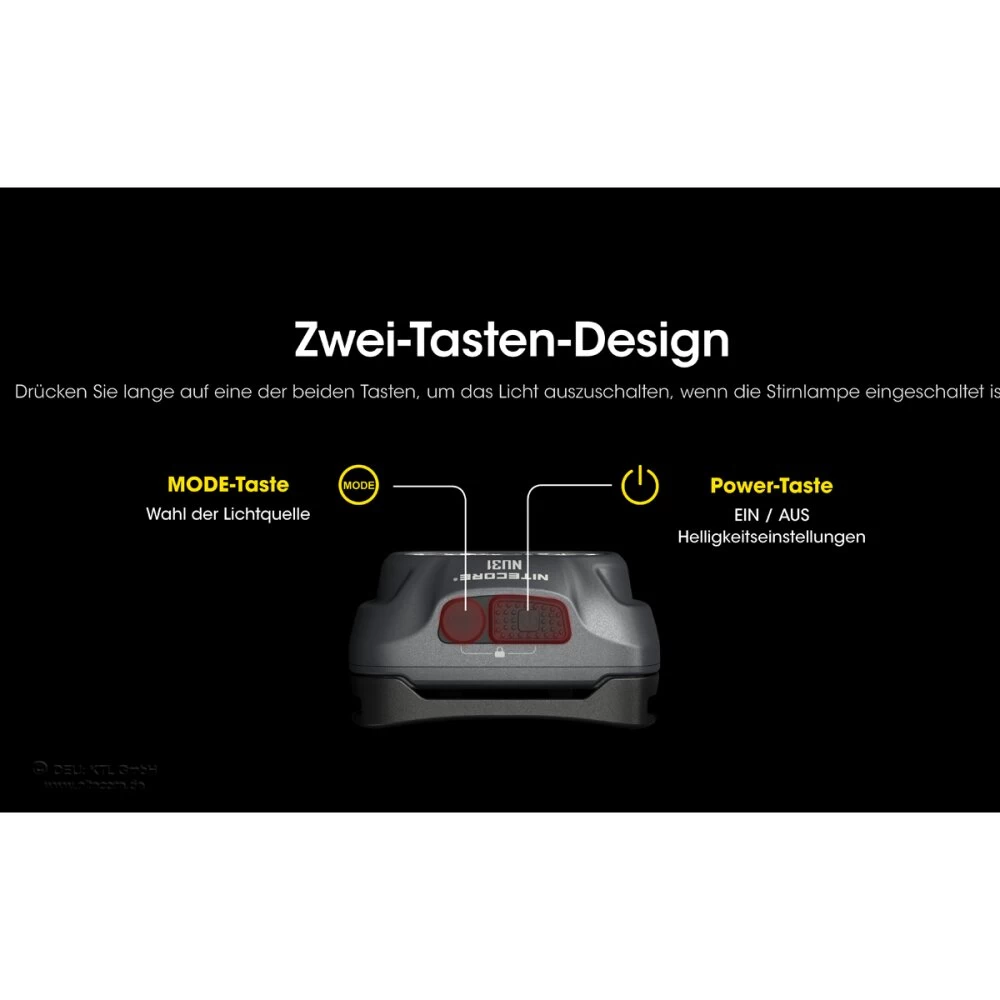 Die Nitecore NU31 ist der „kleine Bruder“ der beliebten NU33 von Nitecore. Der fest verbaute Li-Ion Akku mit 1800mAh kann über einen USB-C-Port in der Lampe geladen werden. Die weiße Haupt-LED leistet maximal 550 Lumen. Für die Ausleuchtung im Nahbereich verfügt die NU31 über eine CRI-LED mit zwei Leuchtstufen. Eine zusätzliche Rotlicht-LED leistet 5 Lumen und erhält die Nachtsichtfähigkeit.