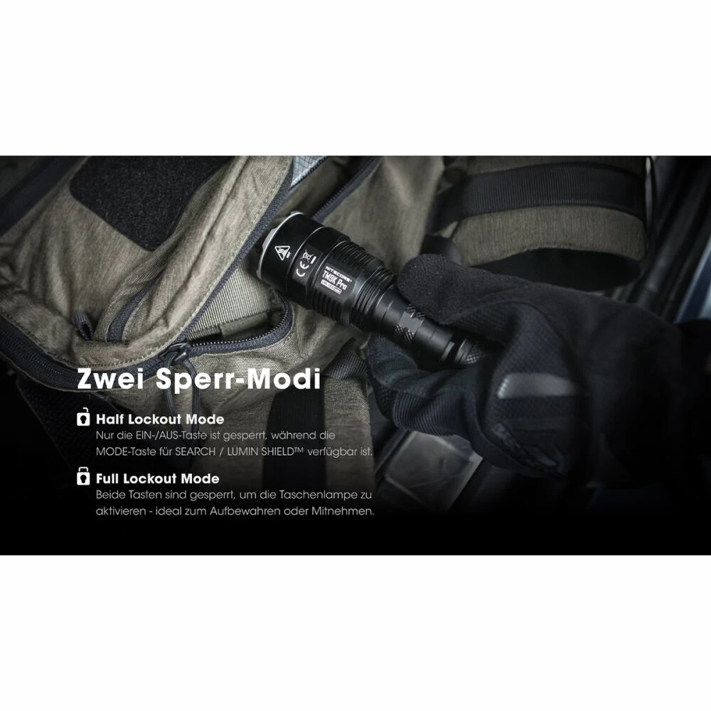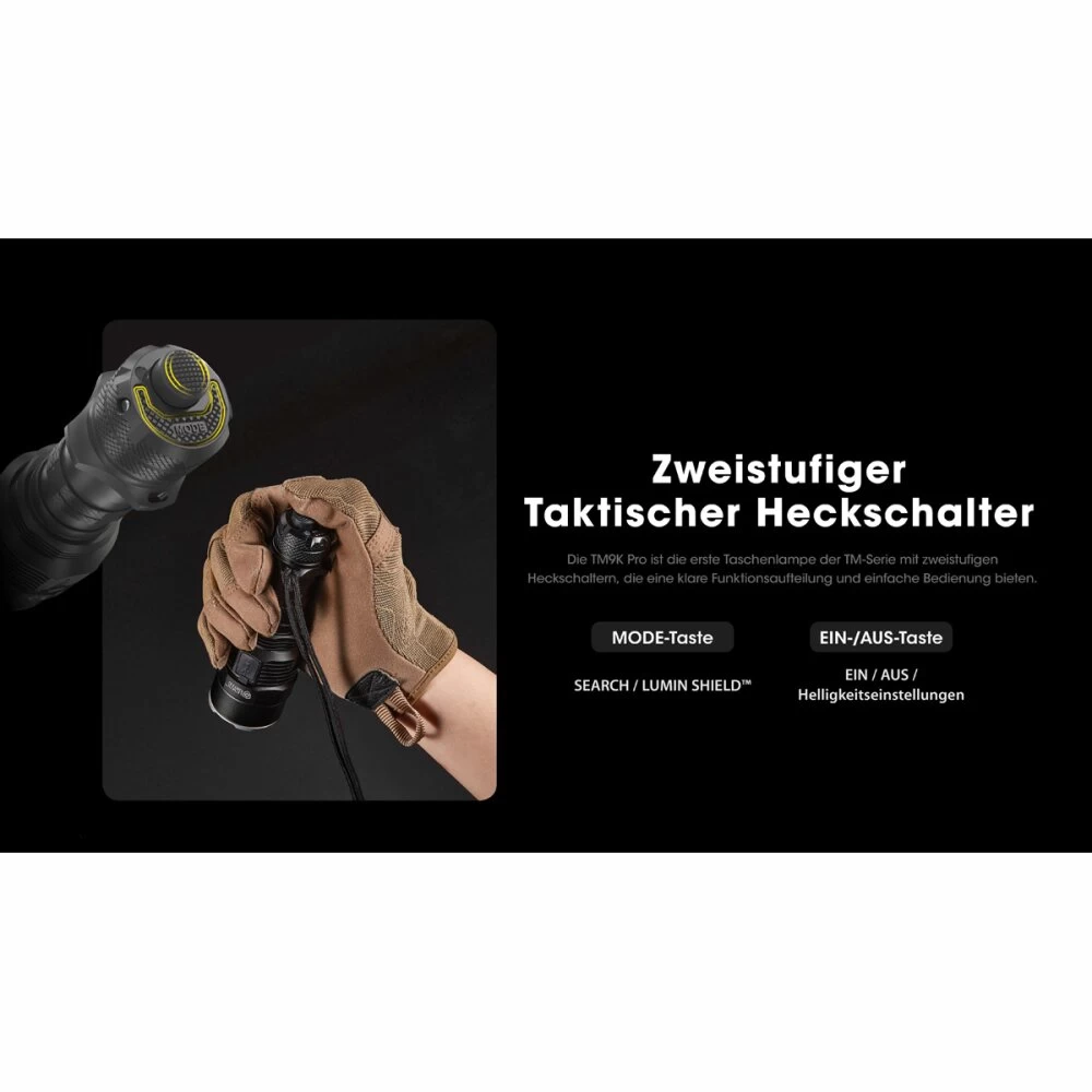 Die Bedienung der TM9K PRO erfolgt über zwei Schalter an der Endkappe: Der Hauptschalter dient zum Ein- und Ausschalten sowie zum Anpassen der Helligkeit, während der Mode-Schalter zwischen SEARCH und LUMIN SHIELD umschaltet. Um ungewollte Aktivierungen zu verhindern, bietet die Lampe zwei verschiedene Lockout-Modi. Eine kleine LED-Leuchte an der Endkappe informiert durch Blinken und Farbänderungen kontinuierlich über den aktuellen Ladezustand des Akkus. Mit ihrer leistungsstarken Beleuchtung und praktischen Funktionen ist die Nitecore TM9K PRO eine vielseitige und zuverlässige Taschenlampe für unterschiedliche Anwendungen.