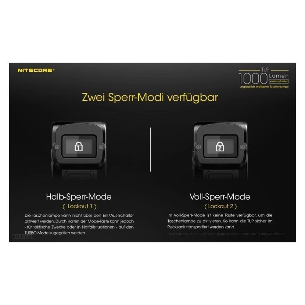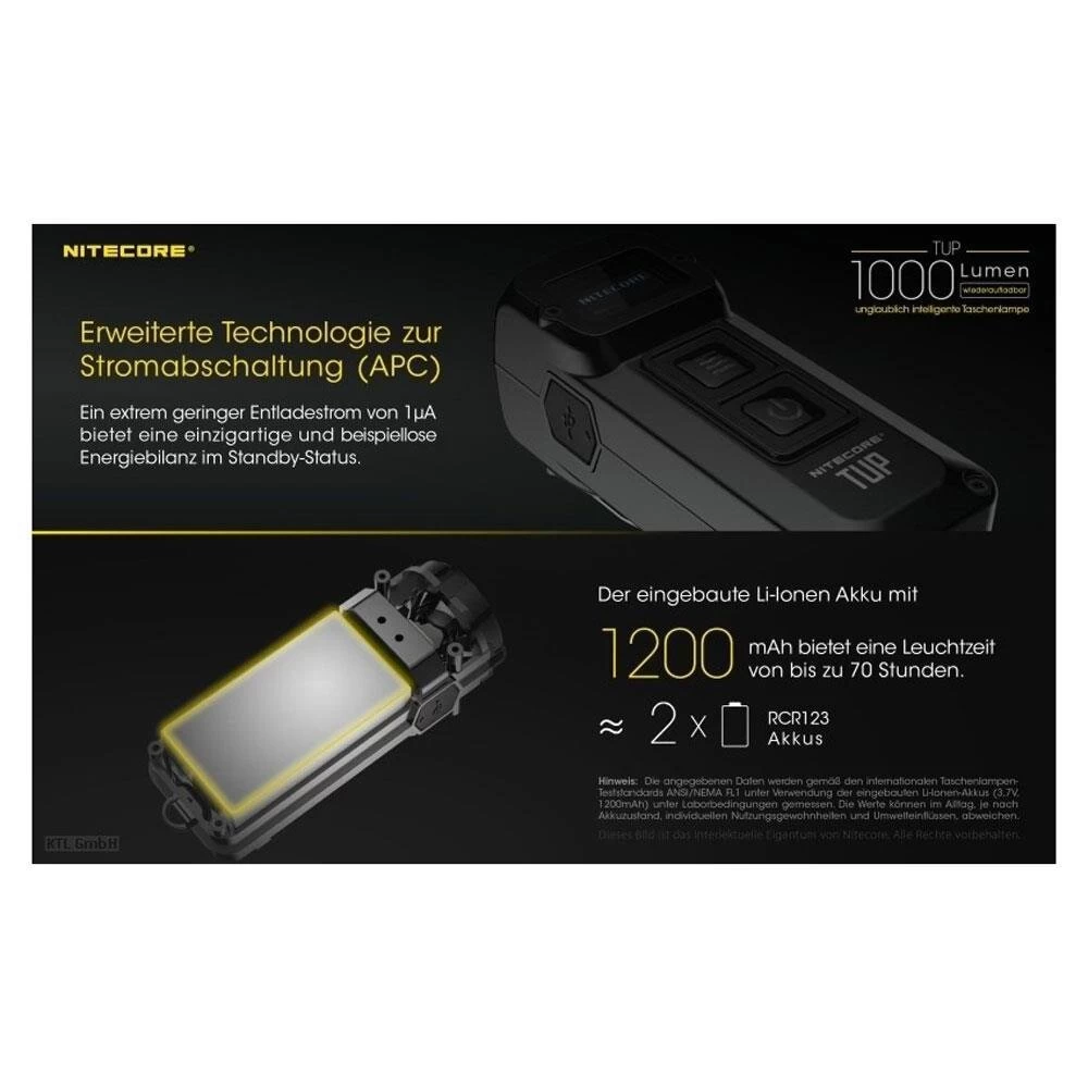 Die TUP verwendet eine CREE XP-L HD V6 LED. Der integrierte Li-Ion Akku mit 1200mAh kann über einen Micro-USB-Port geladen werden. Ein besonderes Feature ist das OLED-Display über das verschiedene Informationen abgerufen werden können. Die eingebaute ATR-Temperatursteuerung verhindert ein überhitzen der Lampe. Es stehen 5 Leuchtstufen zur Verfügung und zwei Betriebsmodi zur Verfügung.