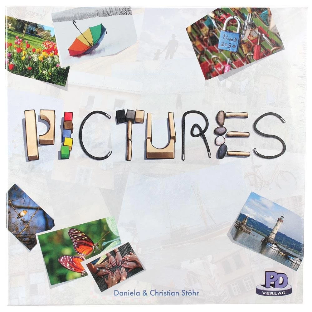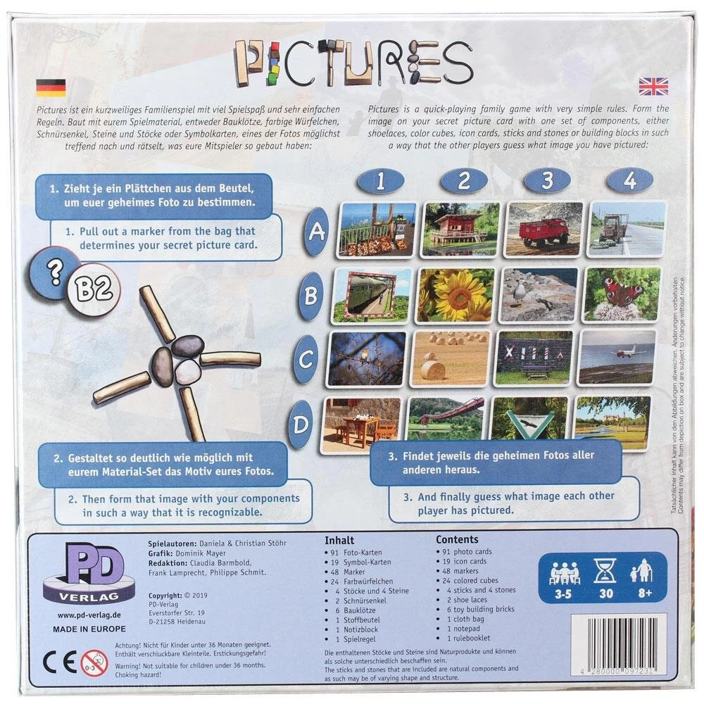 Pictures ist ein kurzweiliges Familienspiel mit viel Spielspaß und sehr einfachen Regeln. Baut mit Eurem Spielmaterial, entweder Bauklötze, farbigen Würfelchen, Schürsenkel, Steine und Stöcke oder Symbolkarten, eines der Fotos möglichst treffend nach und rätselt, was Eure Mitspieler so gebaut haben.