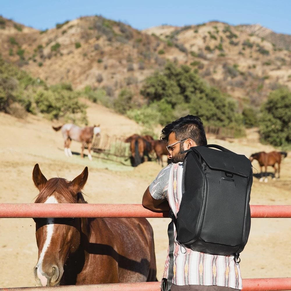 Die zweite Möglichkeit unterscheidet den Everyday Backpack ebenfalls grundlegend von anderen Fotorucksäcken: Neben der Deckelklappe gibt es noch eine Reißverschlussöffnung auf beiden Seiten des Rucksacks. Das eliminiert den größten Nachteil herkömmlicher Rucksäcke mit Zugang von oben – du musst dich nicht mehr durch den Inhalt wühlen! Gleichzeitig erhöht dieses clevere Detail die Alltagstauglichkeit des Rucksacks enorm: Wenn du nämlich nicht nur deine Fotoausrüstung, sondern auch Alltagsgegenstände oder Reisegepäck mitnimmst. Im Everyday Backpack kannst du den Innenraum individuell konfigurieren (mehr dazu unten) und so beides problemlos voneinander getrennt verstauen – und durch die beiden seitlichen Öffnungen auch unabhängig darauf zugreifen. So kannst du außerdem den Rucksack von der rechten Seite aus vor den Körper ziehen, um zum Beispiel auf die Kameraausrüstung im rechten Hauptfach zuzugreifen, während die Alltagsdinge sicher in der linken Rucksackhälfte bleiben und nicht dazwischen kommen. Bequeme, unkompliziert verstellbare Tragegurte helfen dabei. Und da die Außenhülle des Rucksacks auch komplett aus 100 % recyceltem, wetterfestem Nylon hergestellt ist, bleibt der Inhalt selbst dann trocken, wenn es im Herbst nach Schottland gehen soll.