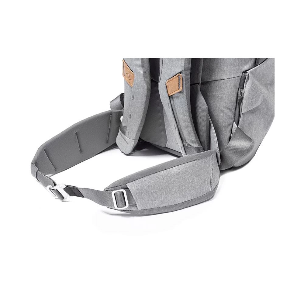 Durch zwei im Gurt integrierte Gelenke lassen sich die beiden Gurtenden einfach nach oben umklappen und im Rückteil des Rucksackes verstauen. Das ist besonders praktisch, solltest Du gerade mal ohne Gurt unterwegs sein wollen. Für die Endteile der Versteller sind am Beckenteil kleine Öffnungen eingearbeitet. Auf der rechten Seite ist eine Halteschlaufe zur Befestigung eines Capture Clips eingearbeitet.