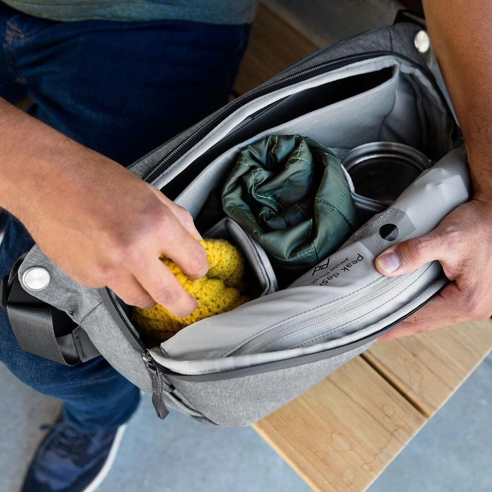 Als Umhängetasche passt sich die Everyday Sling 10L bequem dem Körper an. Ein gepolsterter Schultergurt mit Drehgelenken sorgt für einen optimalen Sitz, die Länge kann zusätzlich mit dem bewährten Peak-Design-Schnellverschluss beliebig angepasst werden. Immer unterwegs? Auch auf Reisen bewährt sich die große Everyday Sling und der stabile Tragegriff hakt die Tasche sicher am Reisetrolleys fest.