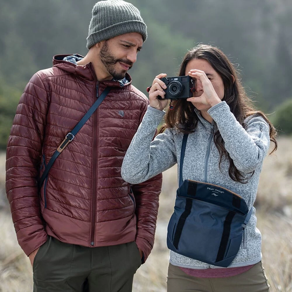 Die Field Pouch V2 setzt die Erfolgslinie einer kleinen, maximal flexiblen Zubehörtasche fort. Die Designlösung für einen Innenraum, der je nach Bedarf mit wächst übernimmt sie von den großen: ähnlich wie bei den Everyday Messengern oder Backpacks erweitert ein Klett-Deckel im Rolltopdesign den Innenraum von 1,5 bis maximal 3 Liter. Genug für eine APSC-DSLM-Kamera mit kurzen Objektiv, wodurch sich die Tasche zur Street-Shooting-Tagestasche mausert. Aber statt der Kamera würde auch ein Tablet Platz finden. Dank des mitgelieferten Tragegurts hast du eine kompakte Umhängetasche, die sofort einsatzbereit ist.