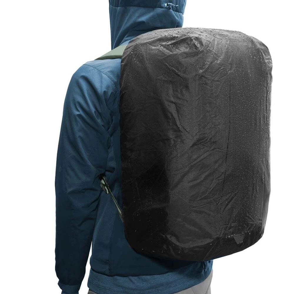 Die Regenschutzhülle besitzt einen angenähten Reißverschlussbeutel, in dem Du die zusammengelegte Hülle unterbringen kannst. Danach kannst Du die Hülle in einem flachen Magnetfach an der Vorderseite des Rucksacks verstauen. Das Fach verfügt über zwei Karabiner, in die sich der Reißverschlussbeutel einhängen lässt, was den Rucksack und die Schutzhülle zuverlässig miteinander verbindet. Bei Bedarf kannst Du die Schutzhülle einfach über den Rucksackziehen, wobei der Rucksack und die Schutzhülle miteinander verbunden bleiben.