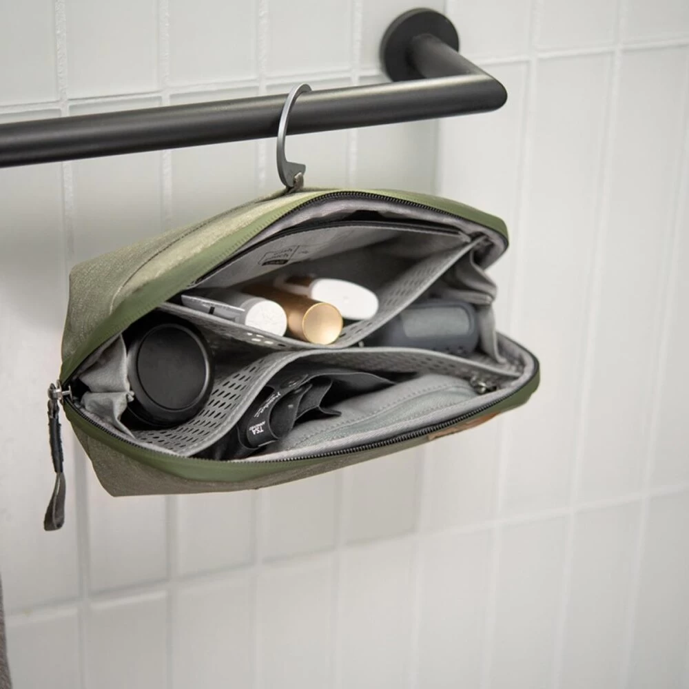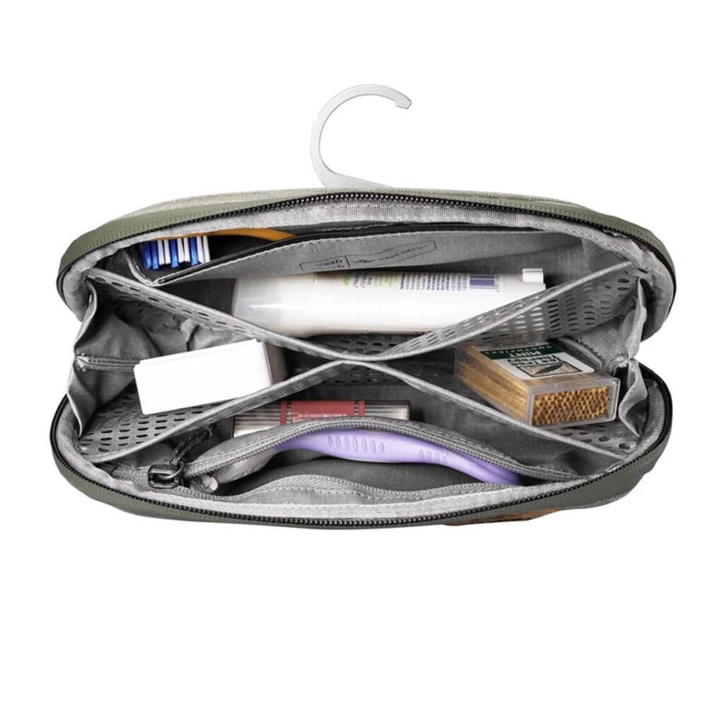 Genug Platz für die Essentials ist vorhanden: Zahnbürste, Rasierzubehör, Deo – und auch auf Netzfächer für kleine Pflegeartikel muss man nicht verzichten. Bewährte Details werden außerdem von der größeren Version übernommen: Der kräftige Alu-Haken zum Aufhängen und das magnetische, leicht zu reinigende Zahnbürstenfach. Die ewige Frage „Wohin mit der feuchten Zahnbürste“ ist damit für alle Zeiten geklärt. Das Hauptfach wird per Netzteiler in zwei Seiten unterteilt, mit zwei zusätzlichen seitlichen Nebenfächern. Außerdem steht ein Reißverschlussfach zur Verfügung. Außerdem ist die Wash Pouch auch ein Modul des Travel-Line-Packwürfel-Systems, so dass sie sich nahtlos in den Backpack 45L integriert.