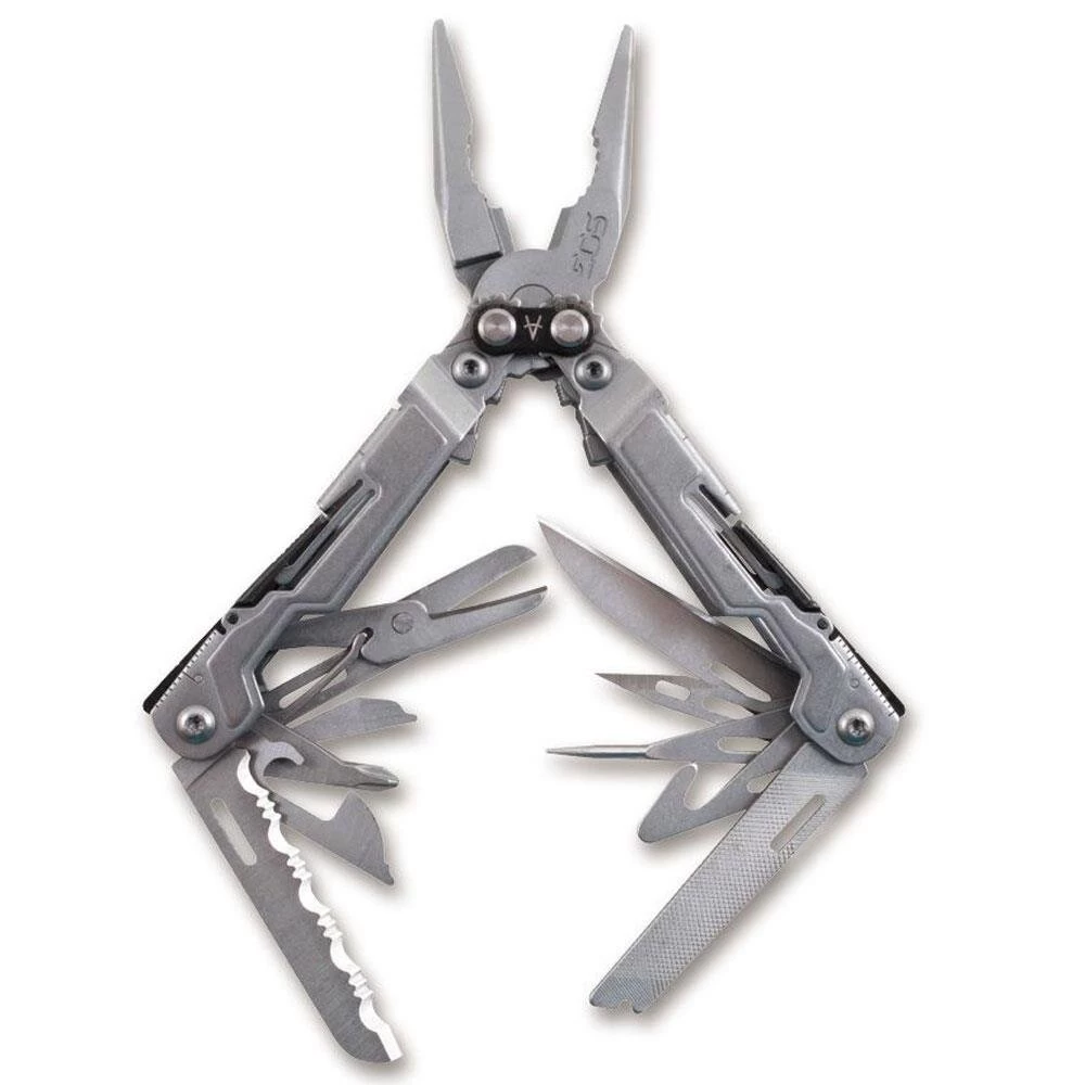 Das SOG PowerPint ist ein vollwertig ausgestattetes Multitool, das angesichts seiner umfangreichen Funktionen und der überaus belastbaren Konstruktion mit einem Gewicht von schlanken 119 Gramm überrascht. Der Zangenkopf mit der bewährten kraftsteigernden Zahnkranzübersetzung enthält vorn die flache Greiffläche als Spitzzange, dann das sogenannte Brennerloch zum Greifen von Außensechskantschrauben, Rohren und Überwurfmuttern, sowie die Schneidfläche mit Hart- und Weichdrahtschneider.