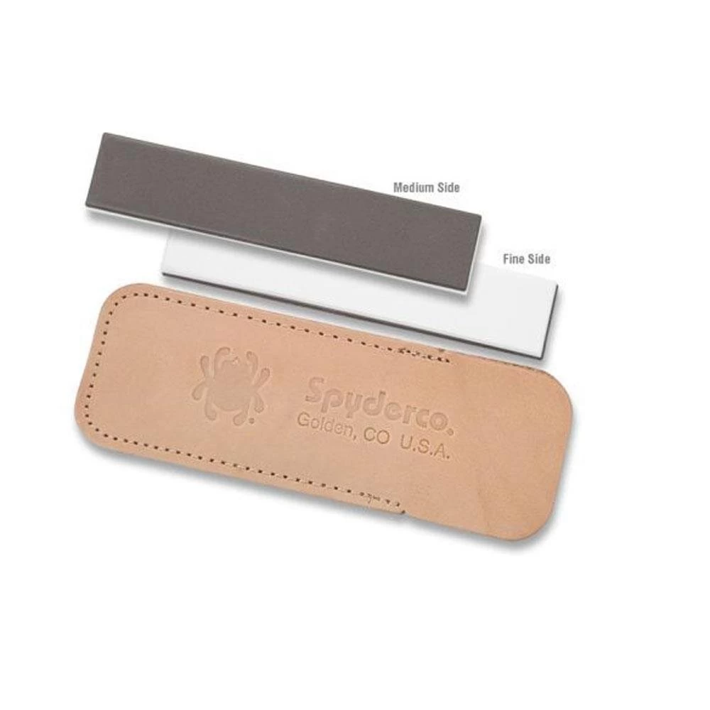 Der Double Stuff Taschenstein-Schleifgerät von Spyderco ist doppelseitig und bietet auf der einen Seite einen mittleren (braunen) Stein und auf der anderen Seite einen feinkörnigen (weißen) Stein. Diese Steine, die dauerhaft mit Industriekleber verbunden sind, bilden ein vielseitiges, kompaktes Schärfgerät, das sich ideal für die Nachbearbeitung unterwegs eignet. Es wird mit einer schützenden Tragetasche aus Wildleder geliefert, die während des Gebrauchs als rutschfeste Unterlage dient und leicht mit Haushaltsreiniger, einem Scheuerschwamm und Wasser zu reinigen ist.