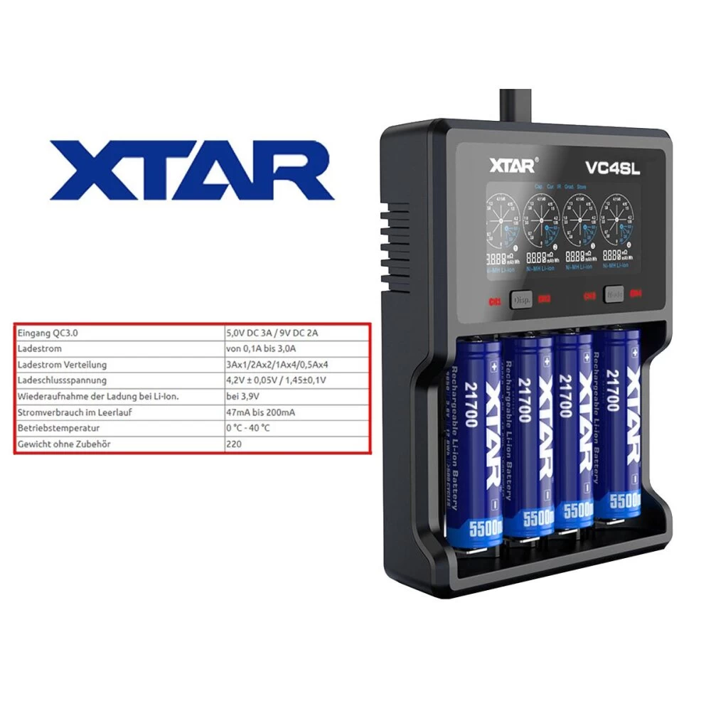 - das Xtar VC4SL kann mit jedem beliebigen oder „Quick Charge“ USB-Adapter betrieben werden